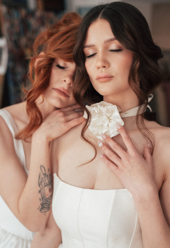 Projektujemy również suknie dla druhen, które harmonijnie wpisują się w stylistykę ceremonii ślubnej, jednocześnie pozwalając każdej z nich poczuć się pięknie i swobodnie. Tworzymy zarówno jednolite kolekcje, jak i indywidualne projekty, dopasowane do wizji Panny Młodej.